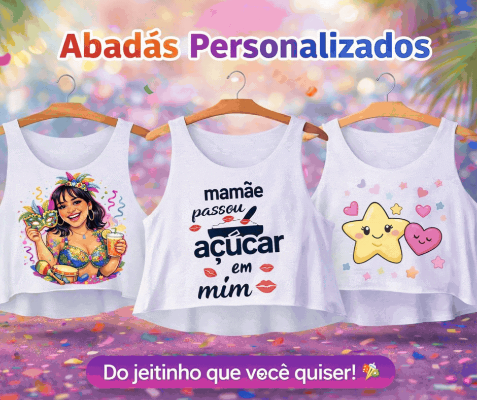 Você escolhe a estampa, frase, personagem, cores e estilo, deixando seu abadá único!