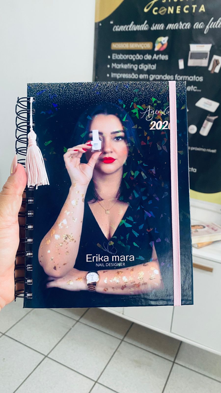 Você escolhe o tema, nome, cores e estilo da capa, deixando sua agenda única.