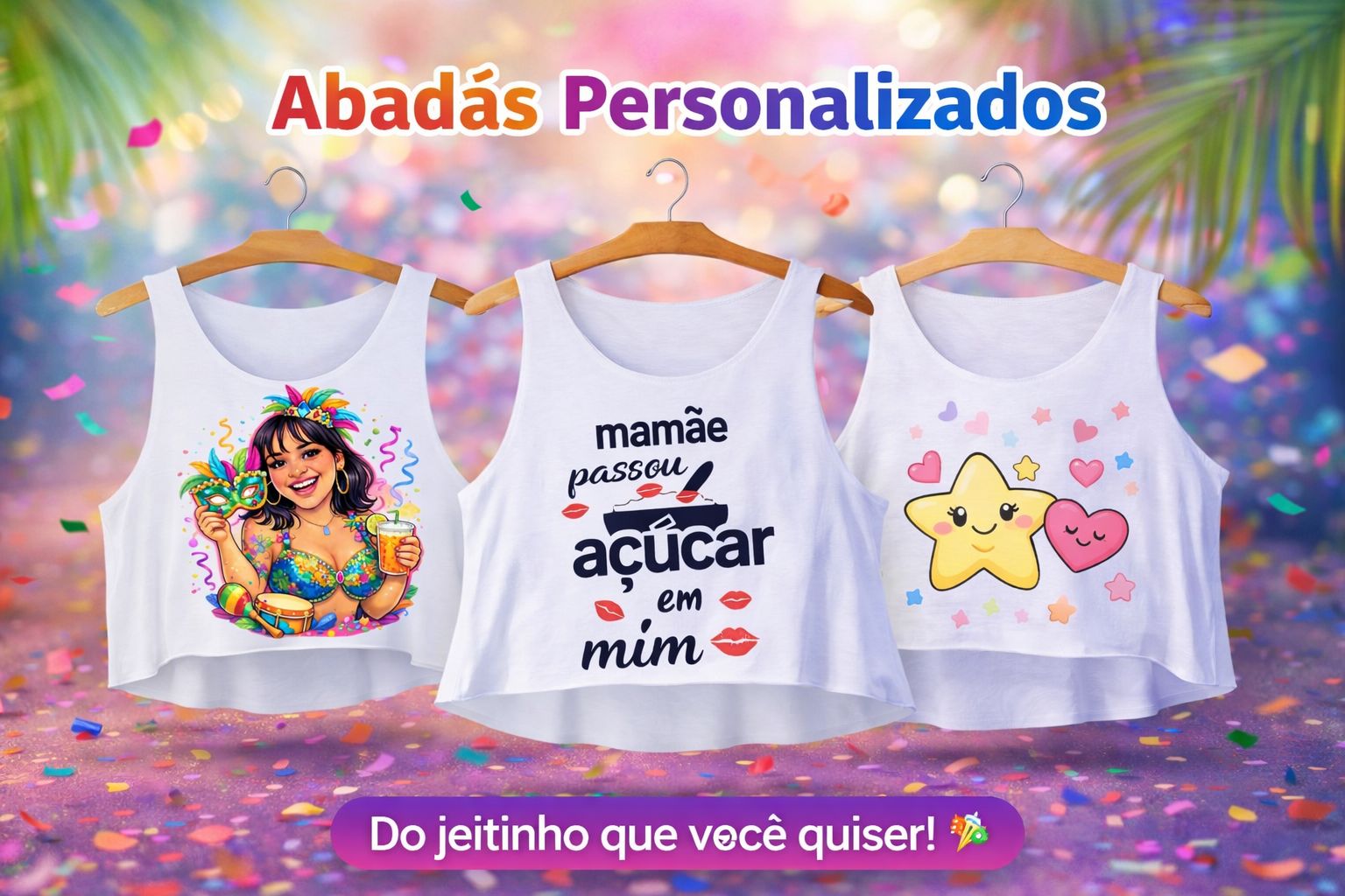 Você escolhe a estampa, frase, personagem, cores e estilo, deixando seu abadá único!
